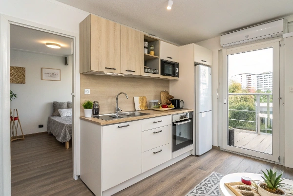 Consistent modern kitchen & wardrobe cabinetry for large-scale housing.