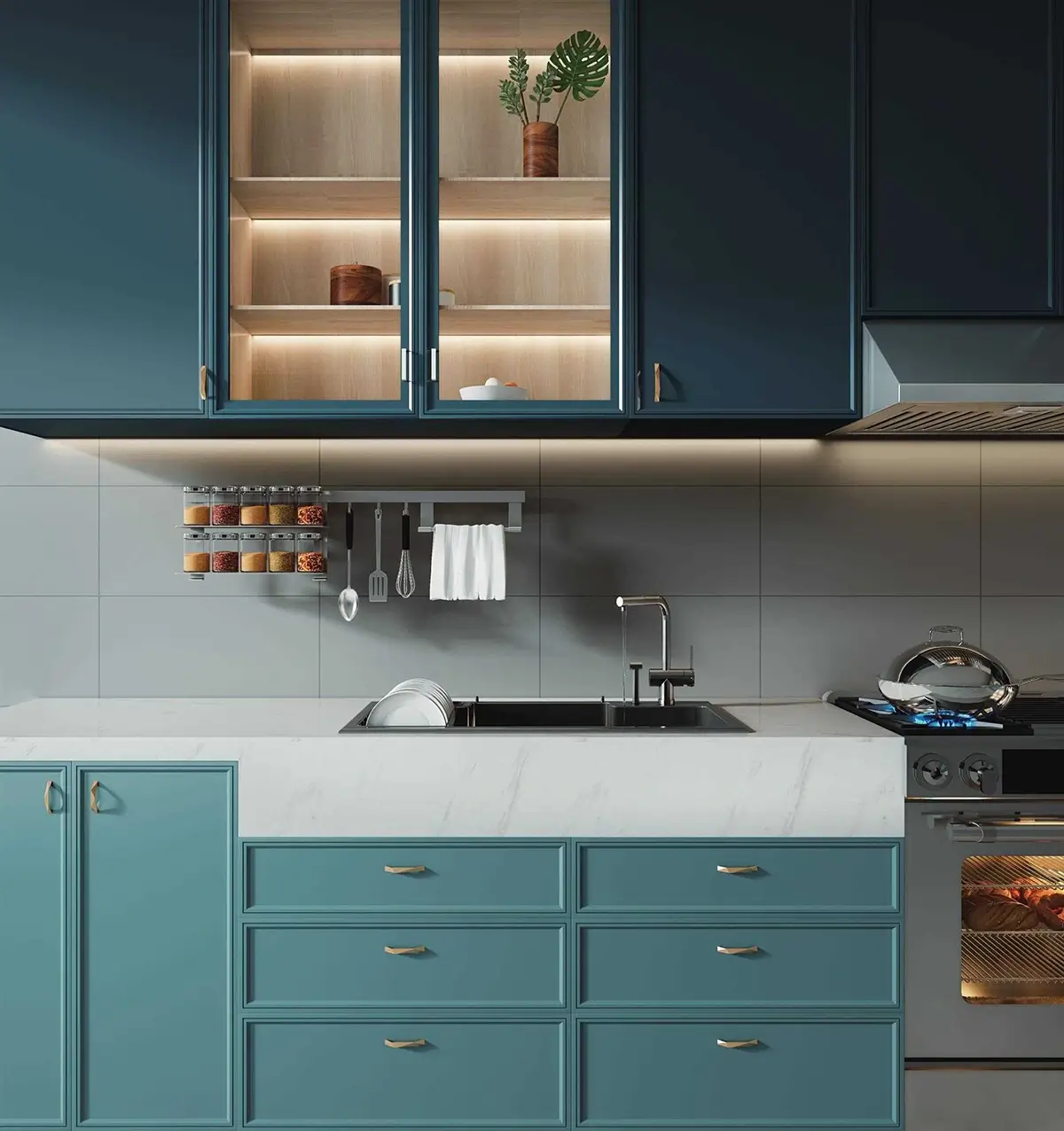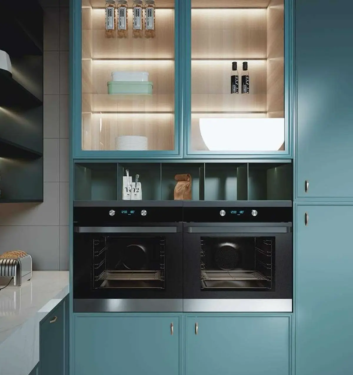 Tall pantry cabinets are designed to maximize vertical storage while maintaining a clean, integrated kitchen layout. They provide ample space for food storage, built-in appliances, and daily essentials, combining functionality with a refined overall appearance.